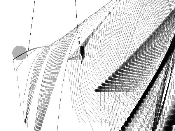 The generative software application was also presented as a site-specific installation for the launch exhibition ‘Movement’ at the Sendai Mediatheque in Japan. For this presentation, the work was displayed using a specialized laser-pointer interface provided by the venue, replacing the traditional mouse with physical gesture.