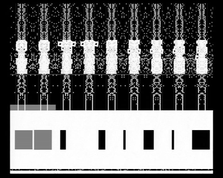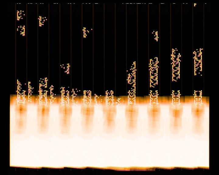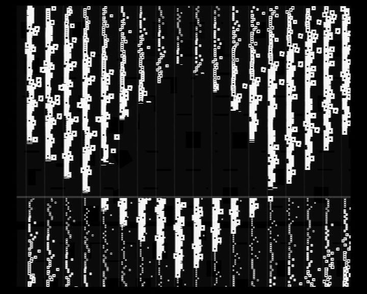 Rhythmic order, graphic disintegration, and in the end sound/image coagulation: hardVideo/G.S.I.L.XIX by Viennese graphic programmer LIA uses the music provided by Portuguese trio @c to create opposing elements of tension between the levels of sound and image. […] The result is an interminable gap between the sound and the accompanying images. Column-shaped “crystallizations,” some of them orange-colored, intensify the impression that each “direct” visualization should be discretely rejected.