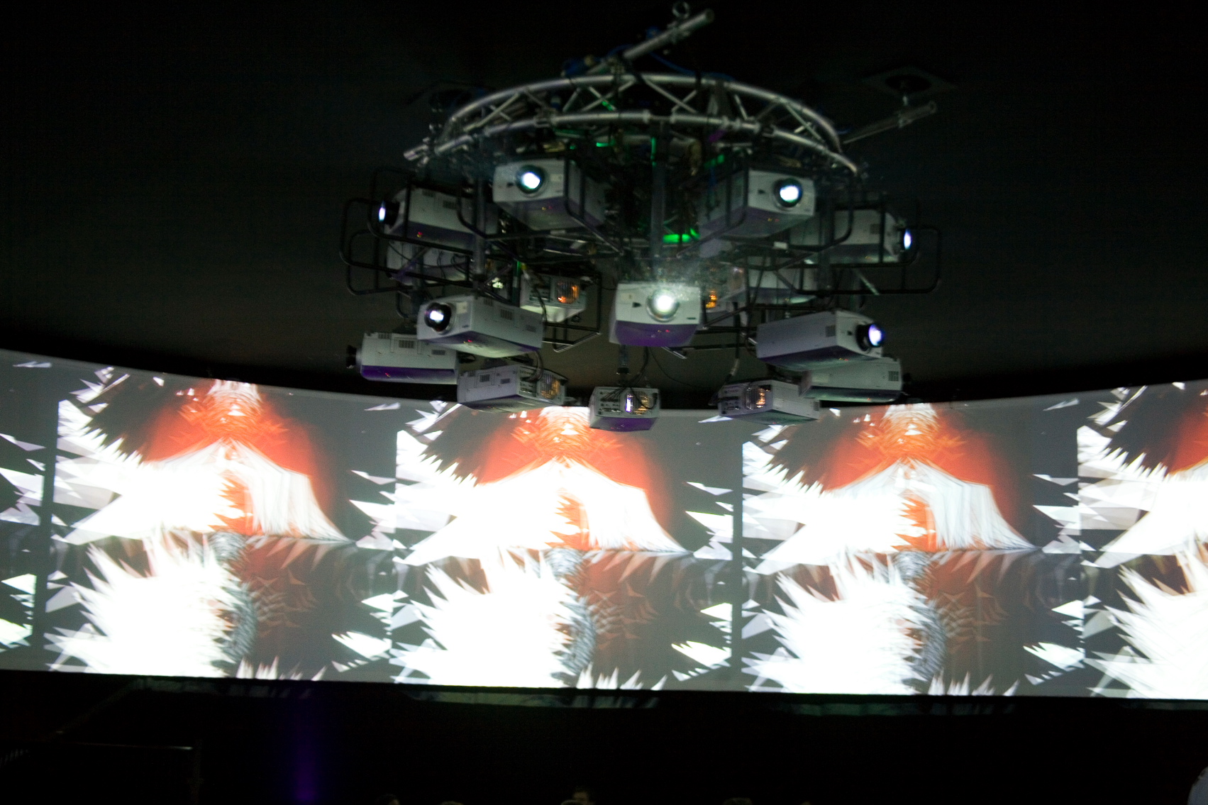 Re-inventing Laurie Anderson’s auteurish art-music of 1981, O Superman, is a hefty challenge, but digital experimenter Lia, collaborating with sound artist @c, succeeds. Anderson’s robotic vocal, “So hold me mom/ In your long arms/ Your electric arms”, is mesmerising as ever, while geometric patterns spawn across the screen as the new bass line thuds. If you arrive in the pod while this is on you’re in for a treat.