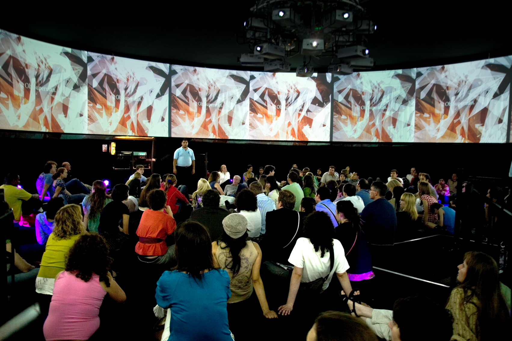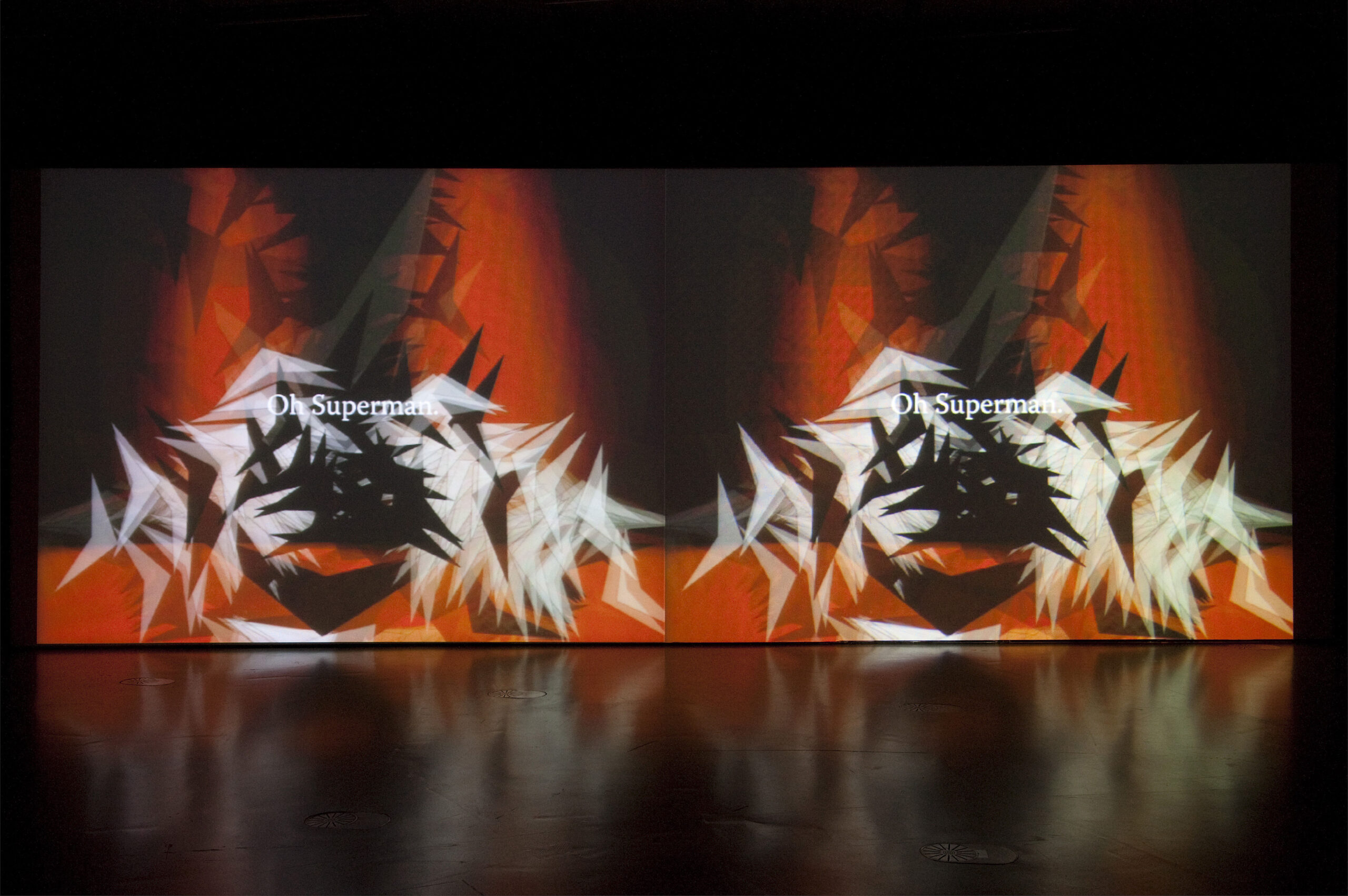 Installation views and video screenshots from the original 360° commission, featuring lyrics from Laurie Anderson’s ‘O Superman’.