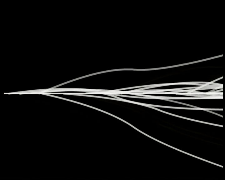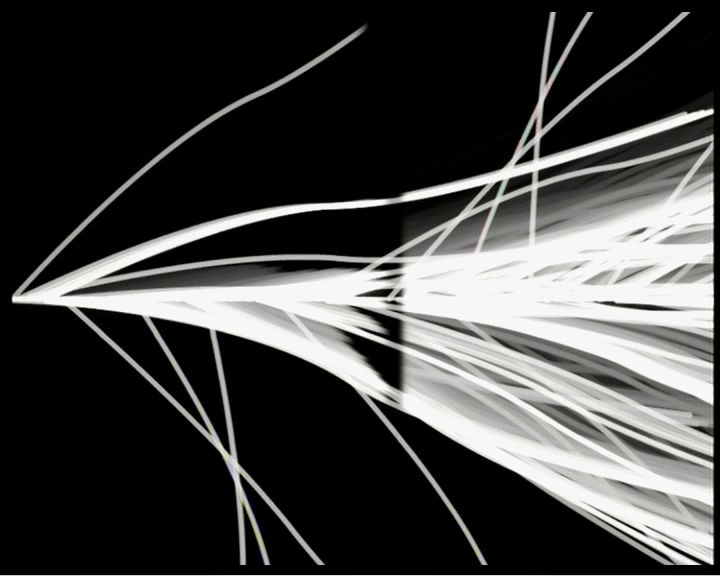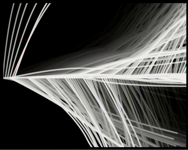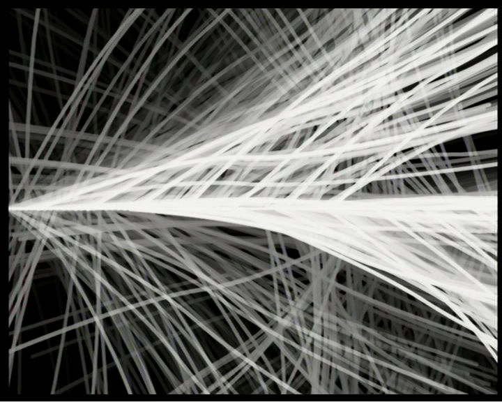 Minimal is maximal: radio_int.14/37 is formal reduction of the finest kind. From a horizontal white line that splits the picture field in the middle, nervous light rays flutter into black ether. […] As though the sound waves were suddenly visible, they increasingly spin a fine net of thin vibrating lines and waves across the screen, which are consistently arrested by the dominant horizontal, the generator, which reacting to acoustic impulses, sends the visual signals off into space like electric eruptions.