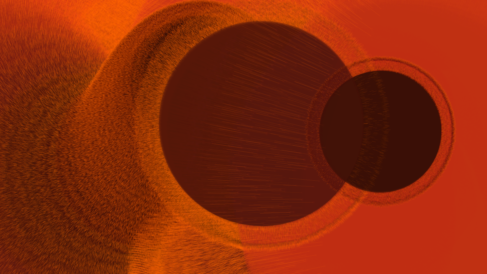 Three Suns is a generative artwork based on the mathematical “superformula.” Three dark objects, defined by bright orange rays, inhabit a shared space. As they circle one another and change in size, they generate a continuous soundscape determined by their relative positions.
