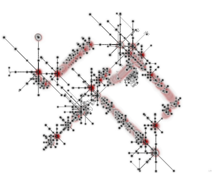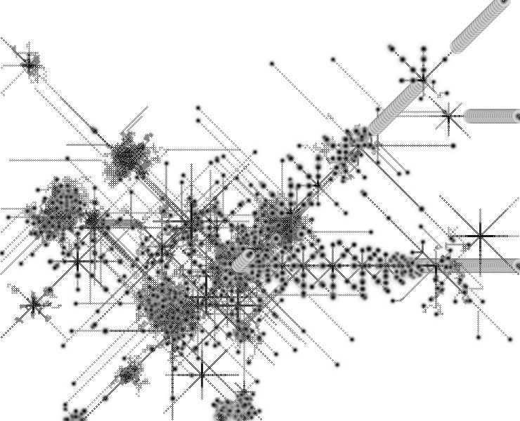 The software visualizes a non-linear decision tree. A musician begins with a specific idea, represented visually. From this point, multiple potential directions emerge. Once a specific direction is selected, it becomes the new starting point for the next set of ideas and developments. The visualization utilizes the specific pixel-based aesthetic characteristic of LIA’s work in Macromedia Director during this period.